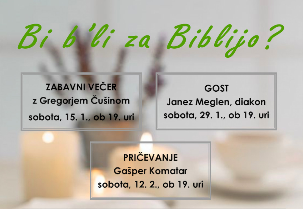 Ponovno se pripravljajo ZIMSKI VEČERI ZA MLADE, poznani tudi kot ČIPS VEČERI. Kot že vrsto let jih v Baragovem zavodu organizira Združenje animatorjev oratorija (ZAO) Novo mesto. Letos je v ospredju rdeča nit »SVETO PISMO.« Dobra vsebina in zanimivi gostje: igralec Gregor Čušin, diakon Janez Meglen, mladi pričevalec Gašper Komatar. Naslov v mladostnem izrazu pa se glasi: 'Bi b'li za Biblijo?'