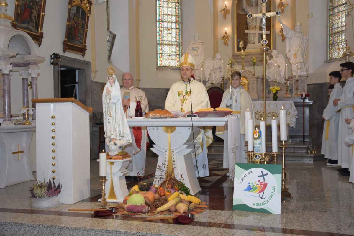 Sledila je sveta maša, pri kateri nas je v pridigi nagovoril gospod škof msgr. dr. Andrej Saje in nam povedal, da je zahvalna nedelja čas hvaležnosti in zavedanja darov. Rekel je, da je zahvalna nedelja dan, ko se Božje ljudstvo ustavi, da se spomni vseh darov, ki jih je prejelo iz Božje roke in da je hvaležnost temeljna drža kristjana. Da ni to nekaj samoumevnega, ampak priznanje, da je vse kar imamo in smo, dar. Zahvalil se je vsem, ki gradijo župnijo kot živo občestvo: duhovnikom, katehistinjam, pevcem, organistom, ministrantom, članom ŽPS, prostovoljcem, vsem, ki skrbijo za cerkev, otroke, lepoto bogoslužja.